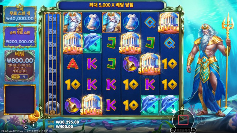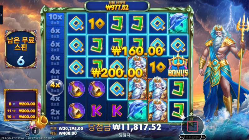 Pragmatic Play의 Waves of Poseidon 은 고대 그리스 신화와 바다의 위엄을 테마로 한 슬롯 게임으로, 시작 화면부터 강한 존재감을 드러낸다. 바다의 신 포세이돈이 릴 옆을 지키고 서 있는 연출은 단순한 배경 장식이 아니라, 이 게임이 ‘배수’와 ‘파동처럼 이어지는 당첨’에 초점을 맞추고 있음을 상징적으로 보여준다. 전체적인 색감은 깊은 푸른 바다를 중심으로 구성되어 있으며, 릴이 회전할 때마다 물결이 일렁이는 듯한 시각 효과가 더해져 몰입감을 높인다. 이 슬롯의 가장 큰 특징은 좌측에 표시되는 배수 레일 시스템으로, 스핀 결과에 따라 배수가 누적되며 당첨의 파괴력이 점진적으로 커진다는 점이다. 단순히 한 번의 큰 히트를 노리는 구조가 아니라, 연속적인 당첨 흐름 속에서 긴장감을 쌓아가는 타입의 슬롯이라 할 수 있다. 모바일 환경에서도 그래픽과 텍스트 가독성이 뛰어나며, 복잡한 설명 없이도 플레이 구조를 자연스럽게 이해할 수 있어 장시간 플레이에도 부담이 적다.