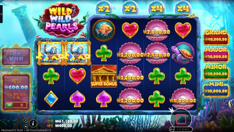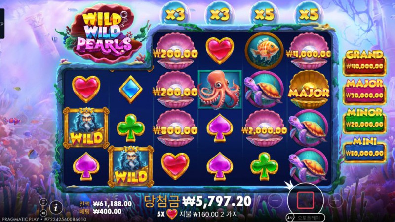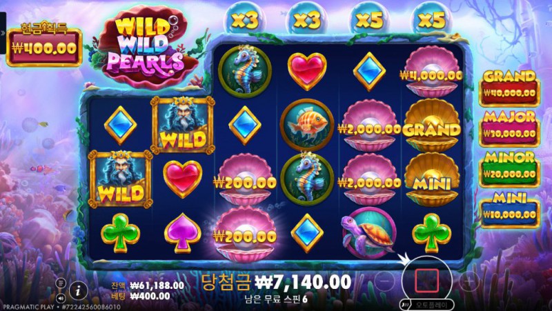 Wild Wild Pearls 는 Pragmatic Play가 선보인 해저 보물 테마 슬롯으로, 깊은 바다 속에서 진주와 보물을 수집하는 콘셉트를 중심으로 전개됩니다. 게임을 처음 실행하면 푸른 바다를 연상시키는 배경과 산호, 해양 생물 심볼들이 자연스럽게 시선을 사로잡으며, 전반적인 색감과 연출은 차분하면서도 고급스러운 분위기를 유지합니다. 과도하게 화려하지 않으면서도 바다 탐험이라는 테마를 충분히 살려, 장시간 플레이에도 시각적 피로도가 낮은 것이 인상적입니다. Wild Wild Pearls의 가장 큰 특징은 ‘와일드’와 ‘진주’라는 핵심 요소를 중심으로 전개되는 보너스 구조입니다. 릴 위에 등장하는 와일드 심볼은 단순한 대체 기능을 넘어, 연속 당첨의 흐름을 만들어내는 핵심 장치로 작용합니다. 특히 특정 구간에서 와일드가 겹치듯 등장할 때 체감되는 기대감은 상당히 높은 편이며, 잔잔하게 진행되던 게임 흐름이 단번에 역전되는 순간도 자주 연출됩니다. 전체적인 게임 템포는 빠르지도, 느리지도 않은 중간 정도로 조정되어 있어 모바일 환경에서도 안정적인 플레이가 가능합니다. 복잡한 규칙 없이 기본적인 슬롯 구조를 유지하면서도, 무료 스핀과 보너스 구매 시스템을 통해 다양한 선택지를 제공하는 점은 Pragmatic Play 특유의 설계 철학이 잘 드러나는 부분입니다. 단순한 스핀 반복이 아닌, ‘언제 보너스에 진입할지’를 기대하며 플레이하게 만드는 구성이 Wild Wild Pearls의 몰입도를 높여줍니다.