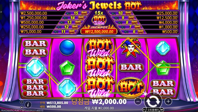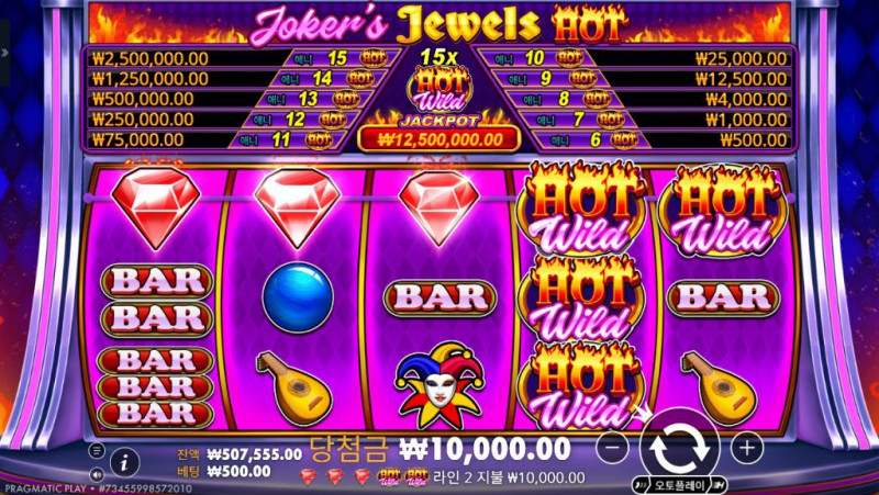 Pragmatic Play의 Joker’s Jewel Hot 은 클래식 슬롯의 정석적인 구조 위에 강렬한 색감과 직관적인 배당 구조를 더한 작품이다. 스크린샷에서 보이는 것처럼 자주색 배경과 불꽃 효과, 그리고 상단에 배치된 대형 잭팟 금액은 시작 전부터 긴장감을 형성한다. 전통적인 5릴 3열 구조를 유지하면서도 “HOT Wild”와 15배 와일드 배수 시스템을 통해 단순함 속에 폭발력을 심어둔 것이 특징이다. 릴에는 보석, BAR, 악기, 불꽃 HOT 심볼 등이 등장하며, 시각적으로 복잡하지 않아 한눈에 흐름을 파악할 수 있다. 최근의 화려한 애니메이션 슬롯과 달리, 이 게임은 빠른 템포와 즉각적인 결과 확인에 초점을 둔다. 특히 상단에 단계별로 표시되는 잭팟 금액은 플레이 내내 목표 지점을 명확히 제시한다. 단순하지만 자극적인 구조, 그리고 강한 변동성은 한 번의 강력한 당첨을 노리는 플레이어에게 매력적으로 다가온다. 기본 게임 구간은 안정적으로 흘러가지만, HOT Wild가 겹치거나 15배 배수가 적용되는 순간 분위기는 급격히 달라진다. 이 대비 효과가 Joker’s Jewel Hot의 핵심 재미 요소다. 전통과 공격성을 동시에 담아낸 하이리스크 스타일 슬롯이라고 평가할 수 있다.