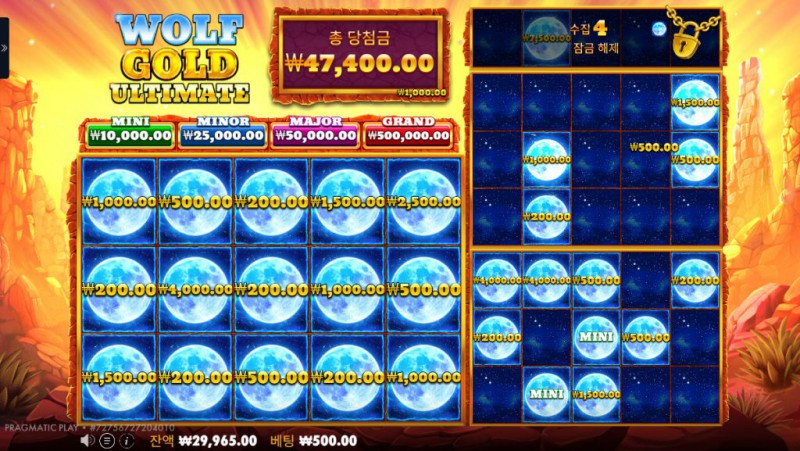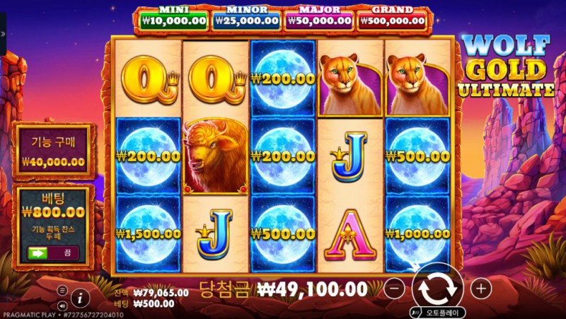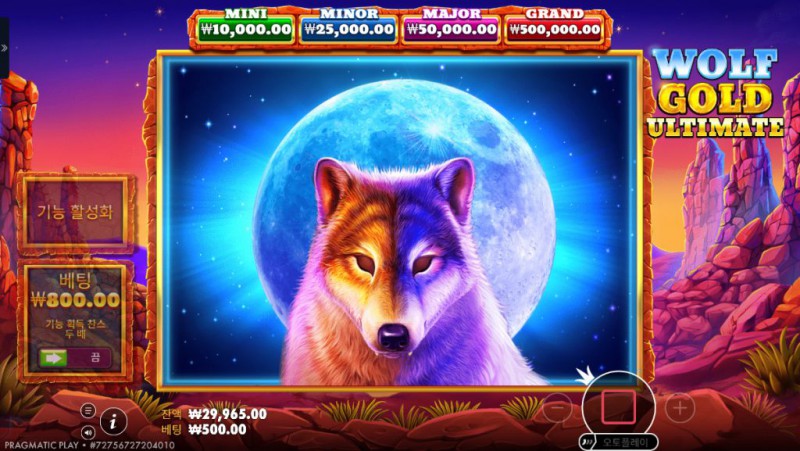 Pragmatic Play의 Wolf Gold Ultimate 은 기존 Wolf Gold 시리즈의 핵심 재미를 더욱 강화해 극적인 순간과 묵직한 보상을 동시에 체감할 수 있는 업그레이드 버전이라 할 수 있다. 강렬한 사막의 노을과 웅장한 암석 지형, 그리고 늑대, 독수리, 퓨마를 비롯한 상징적인 야생 동물 심볼들이 만들어내는 분위기는 플레이를 시작하는 순간부터 긴장감과 몰입도를 끌어올린다. 특히 Ultimate라는 이름답게 보너스 시스템, 머니 리스핀 기능, 다양한 잭팟 구조가 기존보다 한층 정교하게 다듬어져 있어 단순한 스핀 이상의 전략적인 기대감을 제공한다. 스크린샷에서 보이는 다양한 머니 값 심볼과 GRAND, MAJOR, MINOR, MINI로 나뉜 잭팟 단계는 언제든 큰 보상이 폭발할 수 있다는 느낌을 주며, 몇 스핀만 진행해도 무게감 있는 타격감과 꾸준한 보상 흐름을 동시에 느낄 수 있다. 이런 요소들이 자연스럽게 어우러져 Wolf Gold Ultimate은 단순한 슬롯을 넘어 지속적으로 도전하고 싶은 게임으로 자리 잡는다.