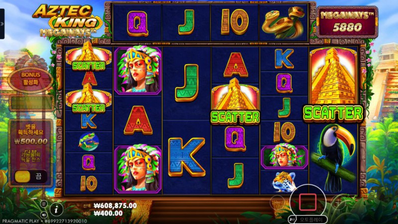 AZTEC KING MEGAWAYS 는 Pragmatic Play가 메가웨이즈 시스템을 완벽히 이해하고 구현해낸 대표작입니다. 게임의 테마는 단순한 ‘고대 문명 슬롯’을 넘어, 탐험과 도전의 서사로 확장됩니다. 릴이 회전할 때마다 숲 속의 짐승 울음소리와 북소리가 어우러지며, 긴장감 넘치는 분위기를 조성합니다. 특히 무료 스핀 모드에서 승수가 끝없이 상승하는 구조는, 메가웨이즈 슬롯의 진정한 매력을 보여줍니다. 초반에는 작지만 꾸준히 누적된 승수와 연속적인 Tumble로 인해, 단 몇 스핀 만에 엄청난 배당이 터지는 장면이 자주 연출됩니다. 이러한 불확실성과 잠재력이 공존하는 구조는 플레이어에게 일종의 ‘도박적 긴장감’과 ‘보상감’을 동시에 제공합니다. Buy Free Spins 기능 역시 전략적 다양성을 부여합니다. 보너스 진입을 기다리지 않고 즉시 도전할 수 있는 자유도는, 고배당을 추구하는 하이리스크 플레이어에게 매력적으로 다가옵니다. 결론적으로, AZTEC KING MEGAWAYS 는 “폭발적 배당”과 “끝없는 승수”의 묘미를 느낄 수 있는 프리미엄 슬롯입니다. 변동성이 높아 다소 도전적인 면이 있지만, 한 번 터질 때의 쾌감은 Pragmatic Play의 어떤 게임보다도 강렬합니다. 아즈텍의 신전이 주는 신비로움 속에서, 한 순간의 대박을 꿈꾼다면 이 게임이 바로 그 무대가 될 것입니다.