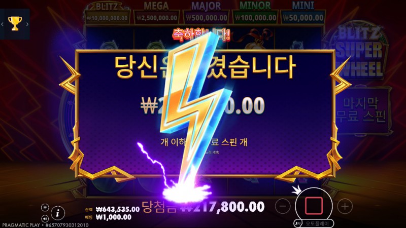 상단의 BLITZ, MEGA, MAJOR, MINOR, MINI 구역 진입 시 고배당 획득 가능 (최대 10,000x)