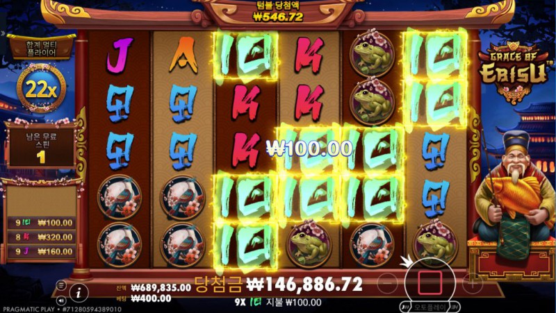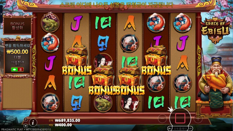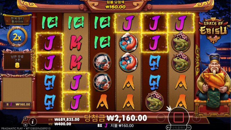 심볼 구성: 전통적 카드 값 심볼과 테마 심볼(에비스, 물고기, 보석 등)으로 구성되어 있으며, 특정 심볼은 보너스·멀티플라이어 트리거 역할을 합니다.