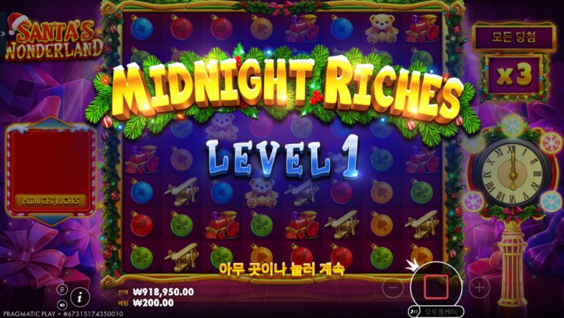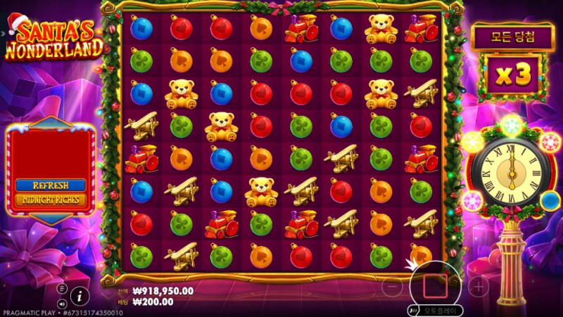 Pragmatic Play의 SANTAS WONDERLAND 는 크리스마스 시즌의 환상적인 분위기를 화려한 그래픽과 풍부한 기능으로 재현한 클러스터 페이 슬롯입니다. 눈 덮인 선물 상자와 반짝이는 장식들이 가득한 화면은 플레이어를 마치 산타의 마법 공방으로 이끄는 듯하며, 매 스핀마다 다양한 변형 기능이 발동되어 단순히 릴을 돌리는 것 이상의 재미를 제공합니다. 특히 Midnight Riches 프로그레시브 기능은 이 게임의 핵심으로, 단계적으로 멀티플라이어를 키워 최대 배당에 도전할 수 있는 긴장감 넘치는 요소입니다. 단순한 시즌성 슬롯을 넘어 전략성과 스릴을 동시에 경험할 수 있는 것이 이 게임의 가장 큰 매력입니다.