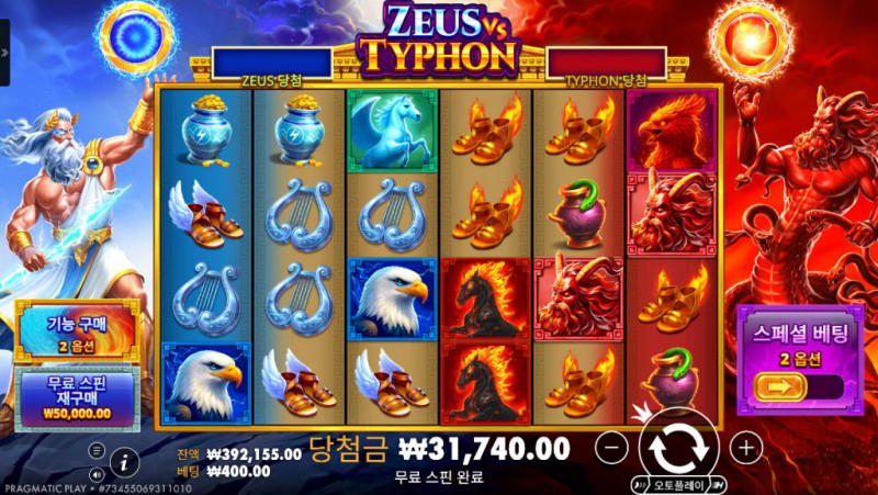 Zeus vs Typhon 은 그리스 신화 속 최고신 제우스와 혼돈의 괴물 티폰의 대결을 테마로 한 Pragmatic Play의 대표적인 고배당 슬롯 게임이다. 화면 좌우를 가득 채운 두 신적 존재는 단순한 배경이 아니라, 플레이 전반의 긴장감과 몰입도를 끌어올리는 핵심 장치로 작용한다. 번개와 화염이 대비되는 비주얼, 강렬한 색채 구성, 그리고 상징적인 신화 캐릭터들은 스핀 하나하나에 서사적 무게감을 더한다. 이 슬롯의 가장 큰 매력은 단순한 구조 속에 숨겨진 폭발적인 잠재력이다. 기본 게임은 직관적이지만, 보너스 진입 이후에는 배수 상승과 연속 보너스 트리거를 통해 흐름이 완전히 달라진다. 특히 보너스 심볼이 연속으로 등장할 때의 연출은 Zeus vs Typhon이라는 이름에 걸맞게 웅장하고 과감하다. 고배당 슬롯을 선호하는 유저라면 한 번쯤은 반드시 경험해볼 만한 작품이다.