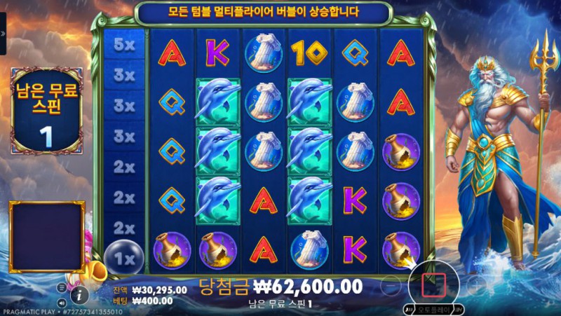 Pragmatic Play의 Waves of Poseidon 은 고대 그리스 신화와 바다의 위엄을 테마로 한 슬롯게임으로, 시작 화면부터 강한 존재감을 드러낸다. 바다의 신 포세이돈이 릴 옆을 지키고 서 있는 연출은 단순한 배경 장식이 아니라, 이 게임이 ‘배수’와 ‘파동처럼 이어지는 당첨’에 초점을 맞추고 있음을 상징적으로 보여준다. 슬롯의 전체적인 색감은 깊은 푸른 바다를 중심으로 구성되어 있으며, 릴이 회전할 때마다 물결이 일렁이는 듯한 시각 효과가 더해져 몰입감을 높인다. 이 슬롯의 가장 큰 특징은 좌측에 표시되는 배수 레일 시스템으로, 스핀 결과에 따라 배수가 누적되며 당첨의 파괴력이 점진적으로 커진다는 점이다. 단순히 한 번의 큰 히트를 노리는 구조가 아니라, 연속적인 당첨 흐름 속에서 긴장감을 쌓아가는 타입의 슬롯이라 할 수 있다. 모바일 환경에서도 그래픽과 텍스트 가독성이 뛰어나며, 복잡한 설명 없이도 플레이 구조를 자연스럽게 이해할 수 있어 장시간 플레이에도 부담이 적다.