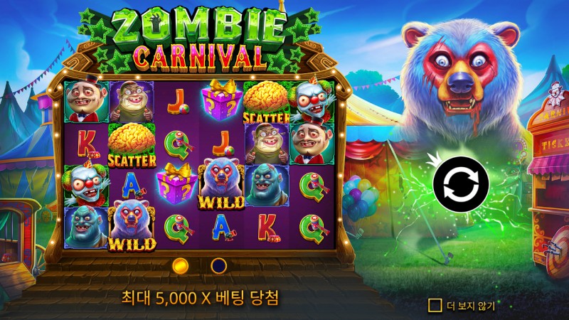 Zombie Carnival 은 공포스러운 좀비와 즐거운 축제라는 서로 어울리지 않는 두 가지 소재를 기발하게 결합한 프라그마틱 플레이의 수작입니다. 흔히 좀비라고 하면 어둡고 잔인한 분위기를 떠올리기 쉽지만, 이 게임은 화려한 서커스 텐트와 익살스러운 캐릭터 디자인을 통해 ‘호러 코미디’적인 매력을 발산합니다. 6×4 그리드와 4,096가지의 방대한 당첨 방식을 채택하여 매 스핀마다 역동적인 게임 플레이를 보장하며, 배경에 깔리는 기괴하면서도 신나는 음악은 축제의 현장감을 더해줍니다. 특히 이 게임은 단순히 심볼을 맞추는 재미를 넘어, 보너스 라운드에서 보여주는 굶주린 ‘좀비 곰’ 와일드의 독특한 메커니즘이 압권입니다. 높은 변동성을 바탕으로 한 강력한 한 방을 기대하는 유저들에게 색다른 시각적 즐거움과 짜릿한 승리감을 동시에 선사할 것입니다.