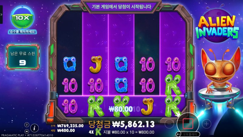 심볼 구성: 다양한 외계 몬스터 심볼이 고배당을 담당하고, 카드 심볼(10, J, Q, K, A)은 저배당을 구성합니다.
